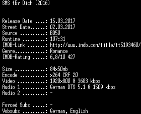| FiLENAME: | SMS.fuer.Dich.2016.German.1080p.BluRay.x264-SPiCY.mkv |