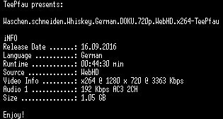 | FiLENAME: | Waschen.schneiden.Whiskey.German.DOKU.720p.WebHD.x264-TeePfau.mkv |