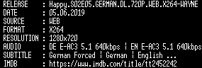 | FiLENAME: | Happy.S02E05.GERMAN.DL.720P.WEB.X264-WAYNE.mkv |
