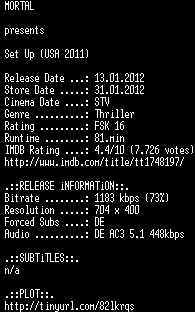 | FiLENAME: | Set.up.2011.German.AC3.DVDRip.XviD-MORTAL.avi |