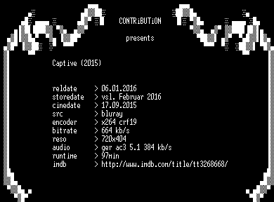 | FiLENAME: | Captive.2015.German.BDRip.x264-CONTRiBUTiON.mkv |