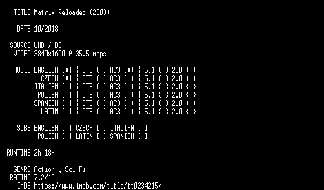 | FiLENAME: | Matrix.Reloaded.2003.German.DL.2160p.UHD.BluRay.x265-ENDSTATiON.mkv |