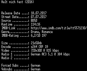 | FiLENAME: | Halt.mich.fest.German.2016.AC3.BDRip.x264-SPiCY.mkv |