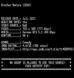 | FiLENAME: | Brother.Nature.2016.German.WebRip.x264-SLG.mkv |