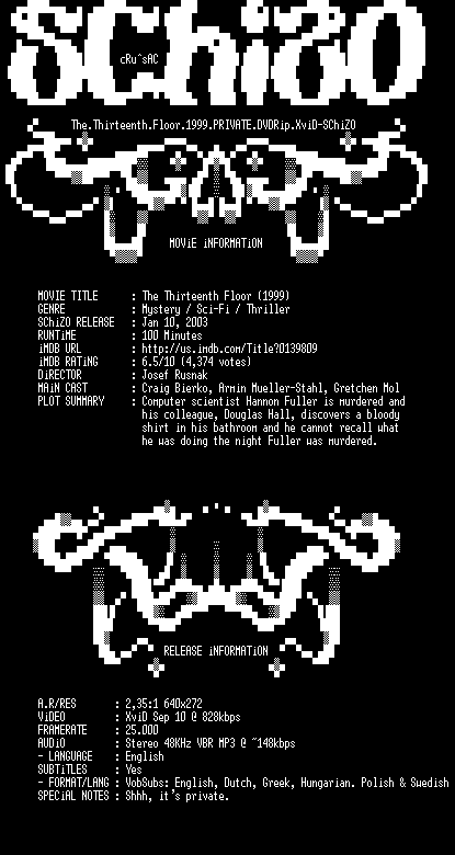 | FiLENAME: | The.Thirteenth.Floor.1999.DVDRip.XviD-SChiZO.avi |