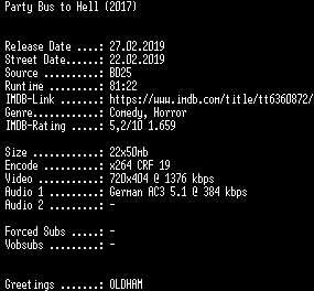 | FiLENAME: | Party.Bus.to.Hell.German.2017.AC3.BDRiP.x264-SPiCY.mkv |