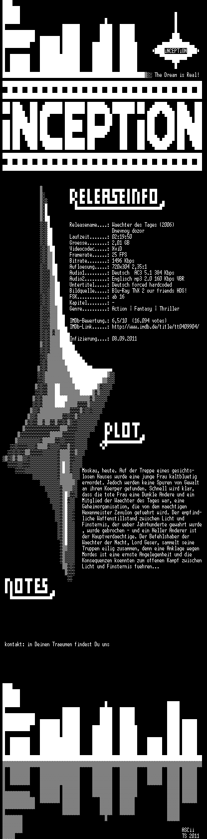 | FiLENAME: | Waechter.des.Tages.2006.DC.German.AC3.DL.BDRip.XviD-iNCEPTiON.avi |