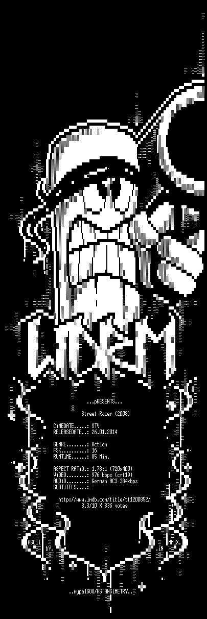 | FiLENAME: | Street.Racer.2008.German.AC3.BDRiP.x264-w0rm.mkv |