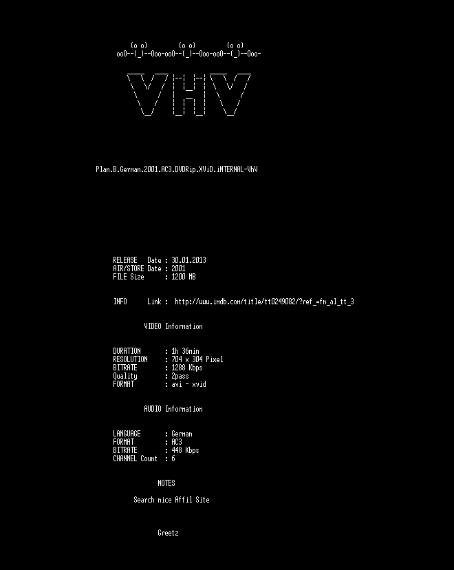 | FiLENAME: | Plan.B.German.2001.AC3.DVDRip.XViD.iNTERNAL-VhV.avi |
