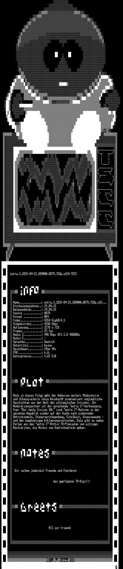 | FiLENAME: | extra.3.2015-04-22.GERMAN.HDTV.720p.x264-TSCC.mkv |