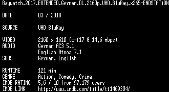 | FiLENAME: | Baywatch.2017.EXTENDED.German.DL.2160p.UHD.BluRay.x265-ENDSTATiON.mkv |