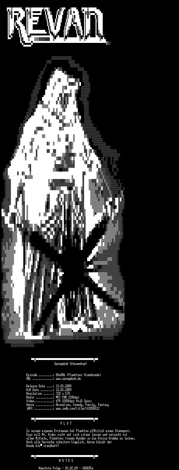 | FiLENAME: | Spongebob.Schwammkopf.S06E08b.Planktons.Stammkunde.German.dTV.XviD-Revan.avi |