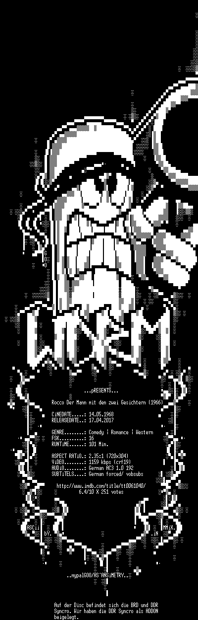 | FiLENAME: | Rocco.der.Mann.mit.den.zwei.Gesichtern.1966.German.BDRiP.x264.READNFO-w0rm.mkv |