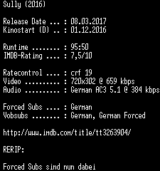 | FiLENAME: | Sully.German.2016.AC3.RERIP.BDRip.x264-COiNCiDENCE.mkv |