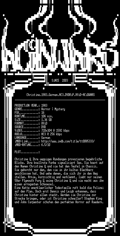 | FiLENAME: | Christine.1983.German.AC3.DVDRiP.XViD-ACiDWARS.avi |