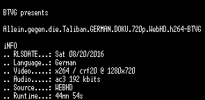 | FiLENAME: | Allein.gegen.die.Taliban.GERMAN.DOKU.720p.WebHD.h264-BTVG.mkv |