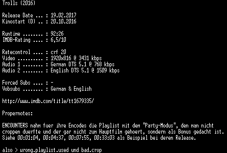 | FiLENAME: | Trolls.2016.German.DTS.DL.1080p.BluRay.x264.PROPER-COiNCiDENCE.mkv |