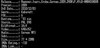 | FiLENAME: | Maenner.fuers.Grobe.German.2009.DVDRiP.XViD-AMBASSADOR.avi |