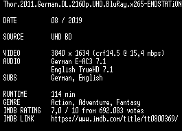 | FiLENAME: | Thor.2011.German.DL.2160p.UHD.BluRay.x265-ENDSTATiON.mkv |
