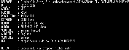 | FiLENAME: | Cinderella.Story.Ein.Weihnachtswunsch.2019.GERMAN.DL.1080P.WEB.X264-WAYNE.mkv |