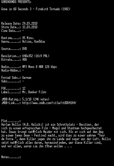 | FiLENAME: | Gone.In.60.Seconds.3.Firebird.Tornado.German.1982.DVDRiP.XViD-GOREHOUNDS.avi |