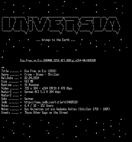 | FiLENAME: | Die.Frau.im.Eis.GERMAN.2018.AC3.BDRip.x264-UNiVERSUM.mkv |