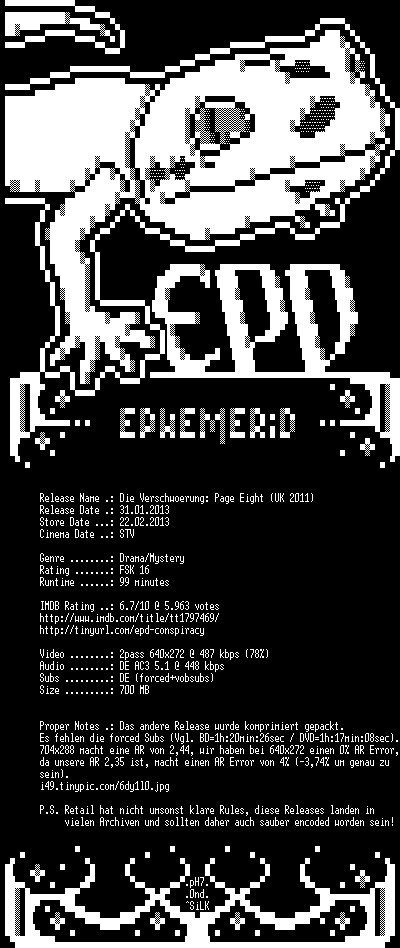 | FiLENAME: | Die.Verschwoerung.Page.Eight.2011.German.AC3.PROPER.BDRip.XviD-EPHEMERiD.avi |
