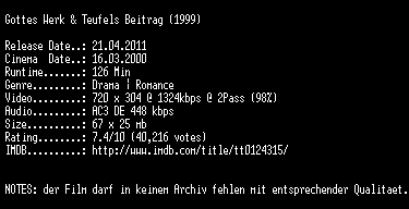 | FiLENAME: | Gottes.Werk.und.Teufels.Beitrag.German.1999.AC3.BDRip.XviD-NQD.avi |