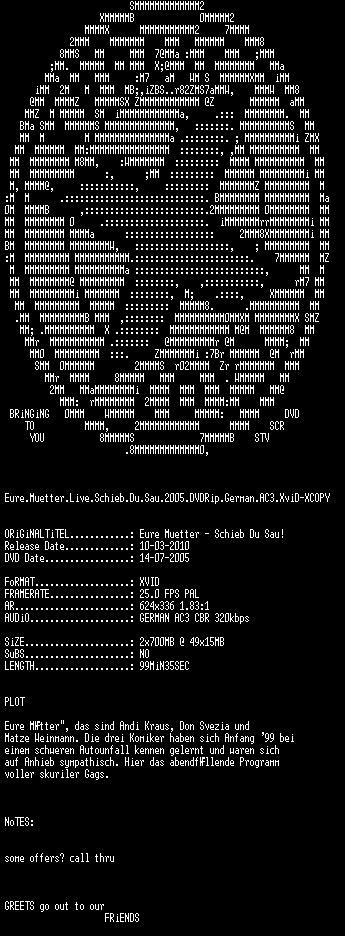| FiLENAME: | Eure.Muetter.Live.Schieb.Du.Sau.German.2005.AC3.DVDRip.XviD-XCOPY.CD2.avi |