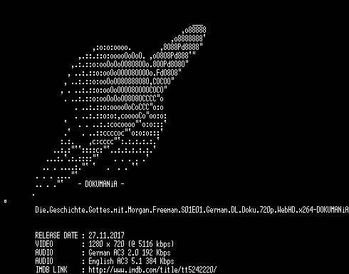 | FiLENAME: | Die.Geschichte.Gottes.mit.Morgan.Freeman.S01E01.German.DL.Doku.720p.WebHD.x264-DOKUMANiA.mkv |