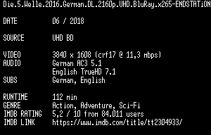 | FiLENAME: | Die.5.Welle.2016.German.DL.2160p.UHD.BluRay.x265-ENDSTATiON.mkv |