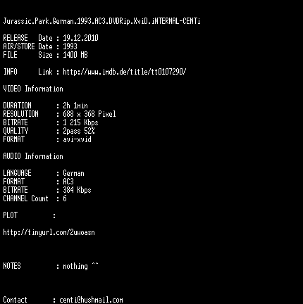 | FiLENAME: | Jurassic.Park.German.1993.AC3.DVDRip.XviD.iNTERNAL-CENTi.avi |