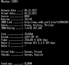 | FiLENAME: | Muenchen.German.REMASTERED.2005.AC3.BDRip.x264-SPiCY.mkv |