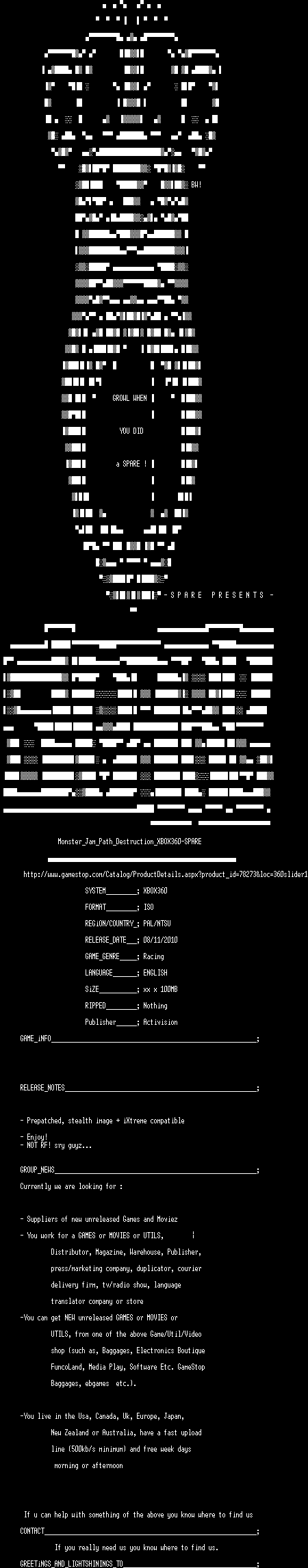 | FiLENAME: | Monster.Jam.Path.Destruction.XBOX360-SPARE.iso |