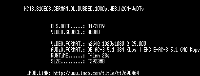 | FiLENAME: | NCIS.S16E03.GERMAN.DL.DUBBED.1080p.WEB.h264-VoDTv.mkv |