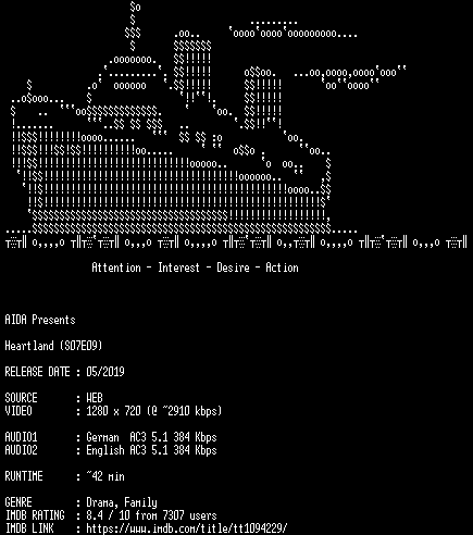 | FiLENAME: | Heartland.S07E09.German.DL.DUBBED.720p.WebHD.x264-AIDA.mkv |