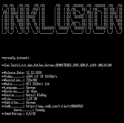 | FiLENAME: | Zum.Teufel.mit.den.Kohlen.German.REMASTERED.1985.BDRiP.x264-iNKLUSiON.mkv |