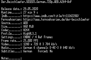 | FiLENAME: | Der.Beischlaefer.S01E03.German.720p.WEB.h264-WvF.mkv |