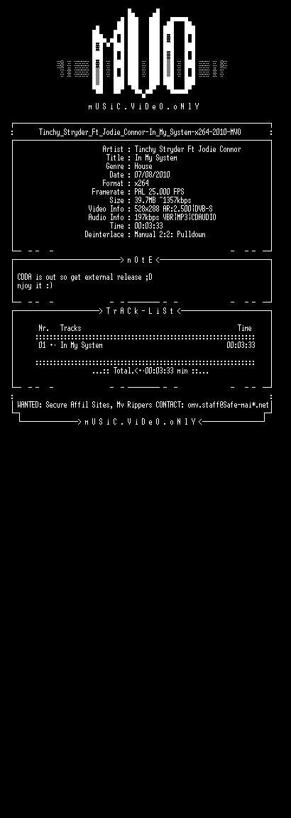 | FiLENAME: | Tinchy_Stryder_Ft_Jodie_Connor-In_My_System-x264-2010-MVO.mkv |