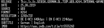 | FiLENAME: | This.Is.Us.S03E06.GERMAN.DL.720P.WEB.H264.INTERNAL-WAYNE.mkv |