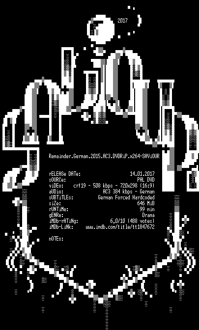 | FiLENAME: | Remainder.German.2015.AC3.DVDRiP.x264-SAViOUR.mkv |