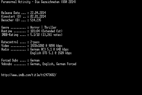 | FiLENAME: | Paranormal.Activity.Die.Gezeichneten.EXTENDED.CUT.German.DL.1080p.BluRay.x264-EXQUiSiTE.mkv |