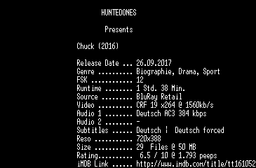 | FiLENAME: | Chuck.Der.wahre.Rocky.German.2016.AC3.BDRip.x264-HUNTEDONES.mkv |