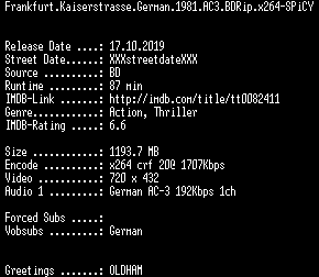 | FiLENAME: | Frankfurt.Kaiserstrasse.German.1981.AC3.BDRip.x264-SPiCY.mkv |