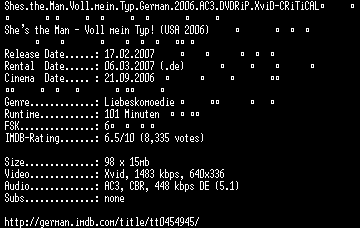 | FiLENAME: | Shes.the.Man.Voll.mein.Typ.German.2006.AC3.DVDRiP.XviD-CRiTiCAL.CD1.avi |