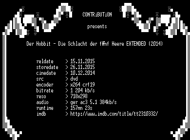 | FiLENAME: | Der.Hobbit.Die.Schlacht.der.fuenf.Heere.2014.EXTENDED.German.DVDRip.x264-CONTRiBUTiON.mkv |