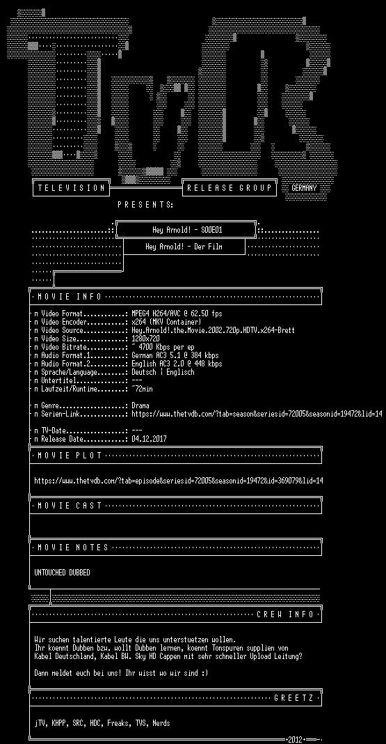 | FiLENAME: | Hey.Arnold.S00E01.Hey.Arnold.-.Der.Film.GERMAN.5.1.DUBBED.DL.AC3.720p.HDTV.x264-TvR.mkv |