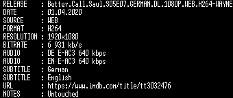 | FiLENAME: | Better.Call.Saul.S05E07.GERMAN.DL.1080P.WEB.H264-WAYNE.mkv |
