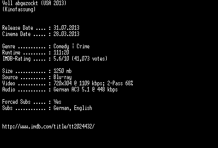 | FiLENAME: | Voll.abgezockt.Kinofassung.German.2013.AC3.BDRiP.XViD-EXQUiSiTE.avi |