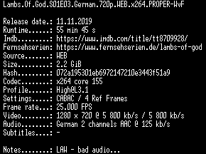 | FiLENAME: | Lambs.Of.God.S01E03.German.720p.WEB.x264.PROPER-WvF.mkv |